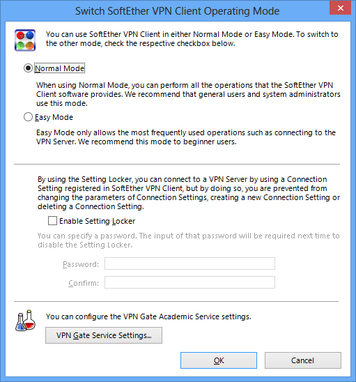 Click the "VPN Gate Service Settings" button the "Switch SoftEther VPN Client Operation Mode" screen.